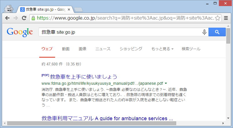 site:という指定をすることで、どんな分類のホームページを検索の対象にするかを指定することができます。