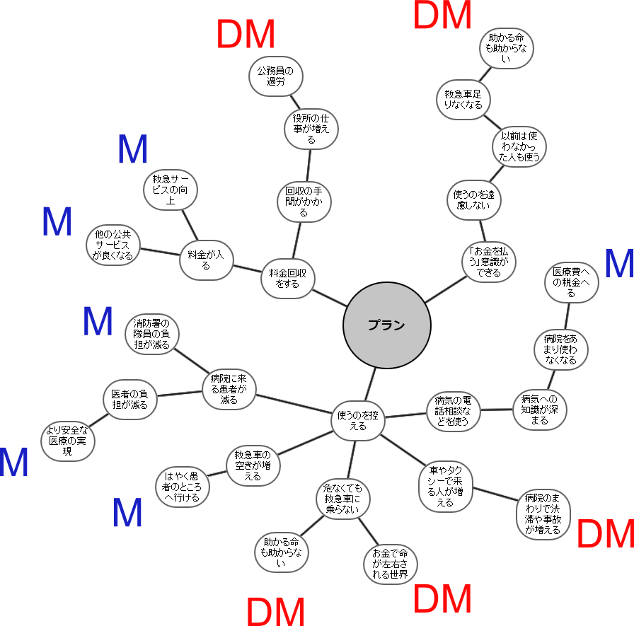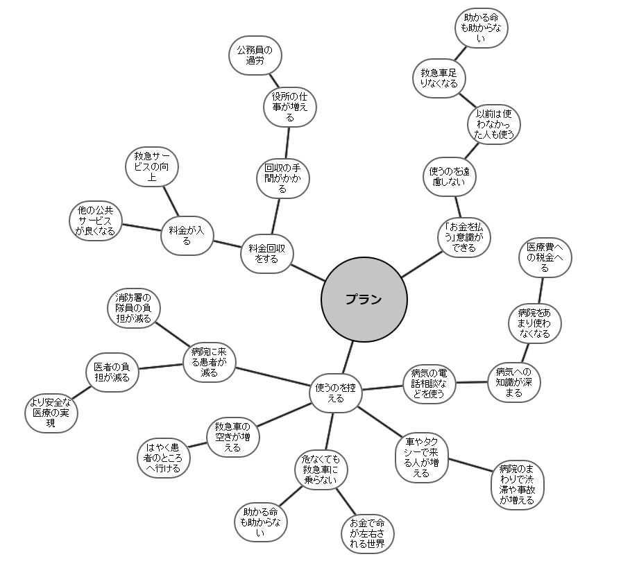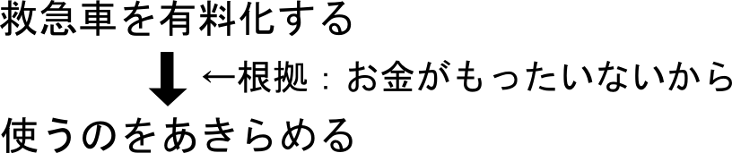 試合の中で何か主張をするときには、「理由(根拠)」と「結論」をきちんと言う必要があります。 たとえば、「救急車を有料化した」ら「使う人が減る」という主張をしたいときには、どのように話をすれば良いのでしょうか。