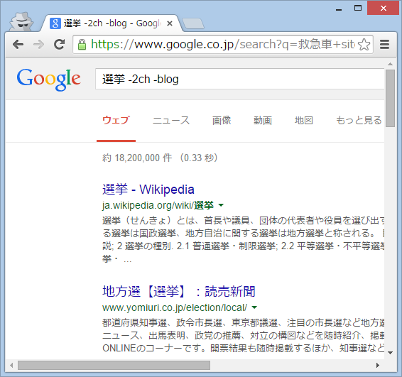 検索の結果の中から、ある言葉の入っているものを取り除きたいときに使います。たとえば、ブログや掲示板の情報を除きたいときには、以下のように入力します。