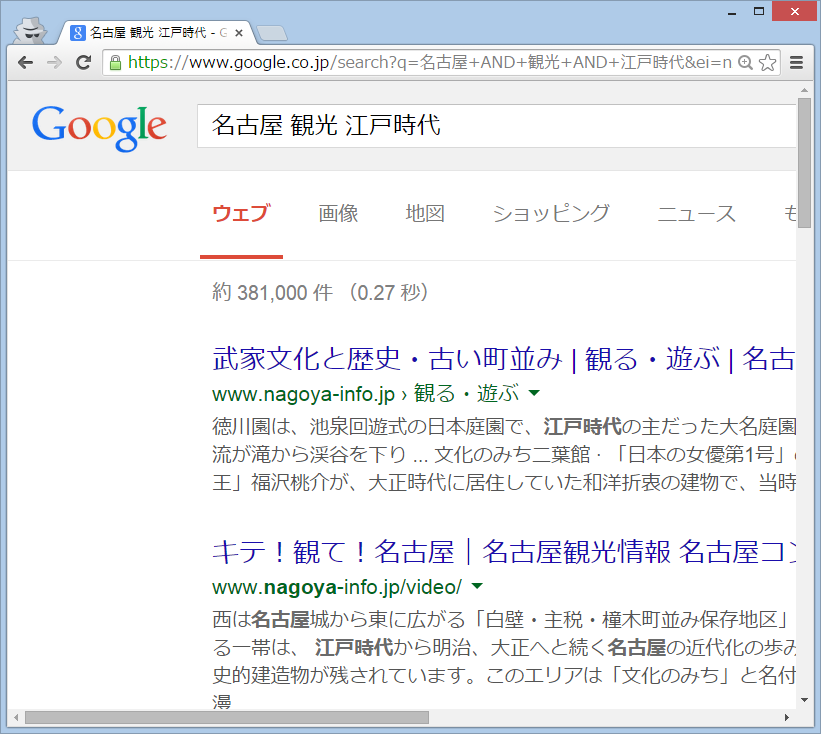 このように、《『名古屋』と『観光』と『江戸時代』のすべてに関係のある情報を探したい》というときには、3つの言葉を「AND」でつなげることで結果を絞り込むことができます。